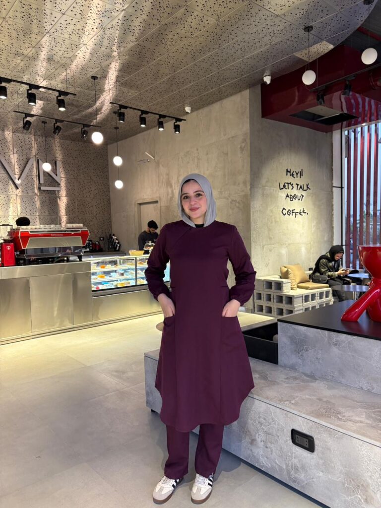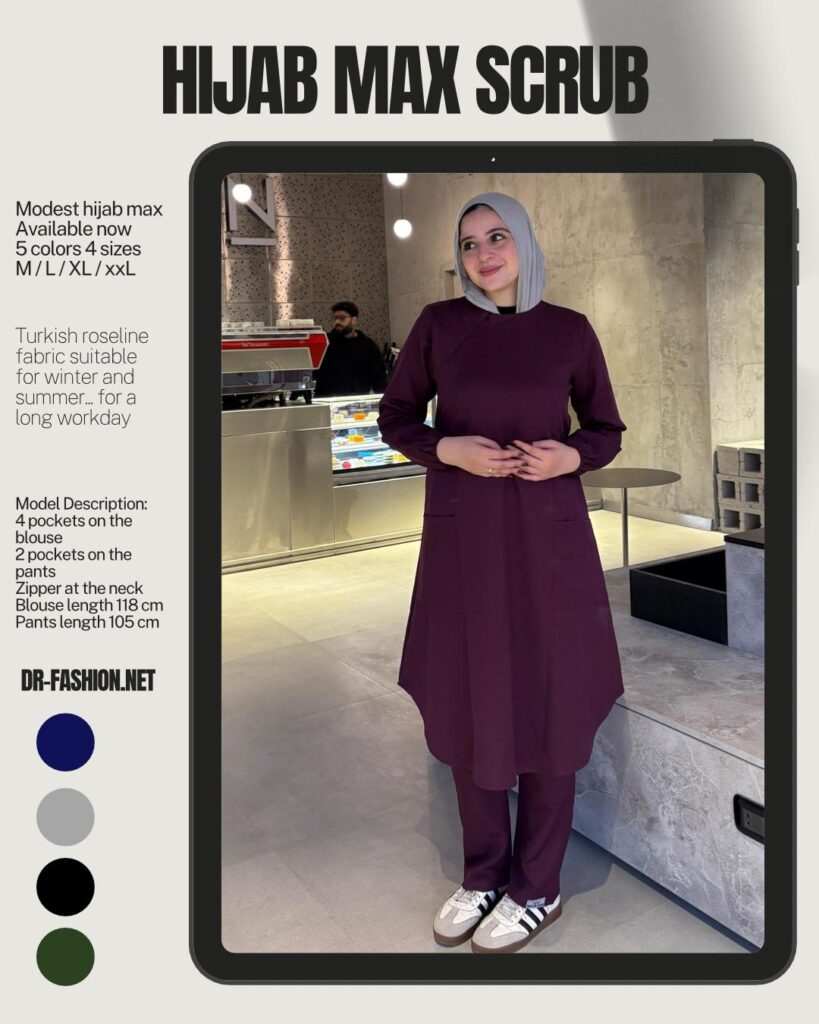hijab max scrub color: dark magenta material ; rozalin Türkiye model description: 4 pockets on plouse 2p0ckets on pants zipper