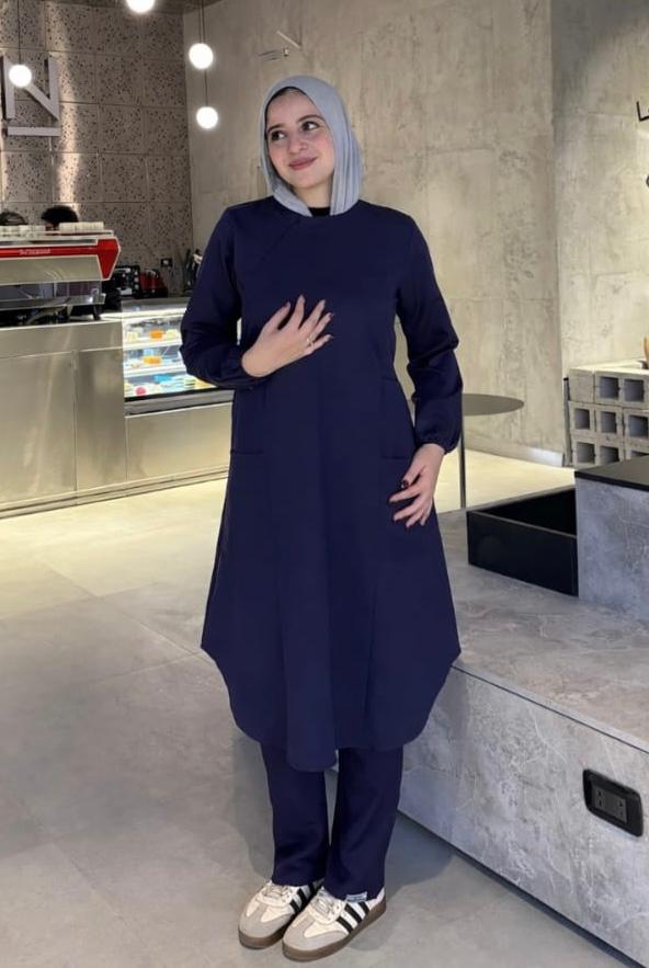 hijab max scrub color: dark blue material ; rozalin Türkiye model description: 4 pockets on plouse 2p0ckets on pants zipper