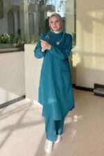 Featuring a long blouse (120 cm) paired with wide-leg pants for a relaxed, flattering fit.
